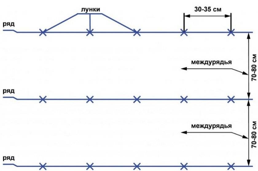 Схема посадки для низкорослых, но раскидистых кустов Лаптя рекомендуется такая: 35х60 см. В регионах с влажным летом можно еще больше увеличить интервал между лунками. Глубина заделки не должна превышать 7-8 см.