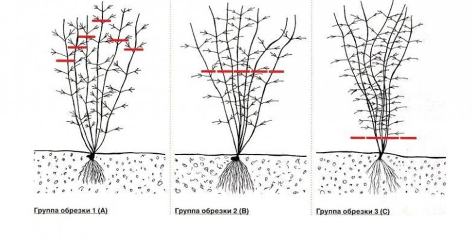 Обрезка второй группы растений (сорта с крупными цветами, которые цветут весной на побегах прошлого года, а затем повторяют цветение на приросте текущего года) проводится в возрасте 1 год на высоту до 30 см, у двухлетних побегов допускается удалить до 1,5 м кустовых побегов.