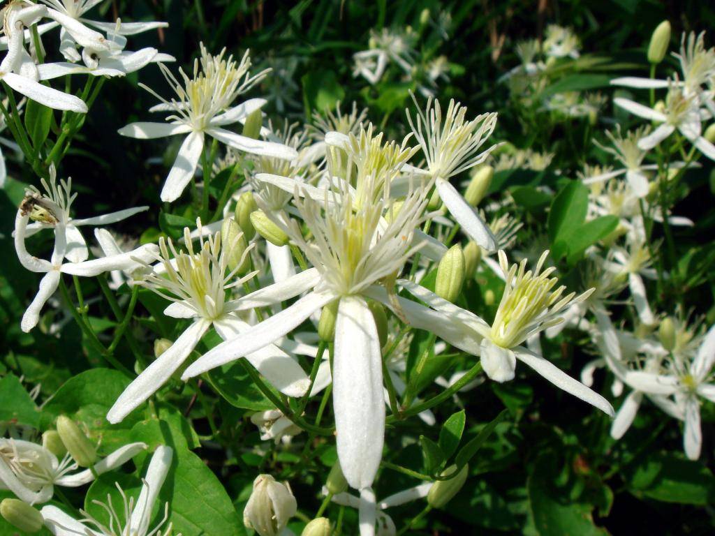 Несмотря на довольно скромные размеры цветов, их так много, что создается ощущение, будто перед вами огромное белое облако, к тому же очень ароматное: цветы пахнут медом с изысканным миндальным оттенком. Цвести этот сорт начинает в середине лета и продолжается до его завершения. Жгучий клематис, обладающий высокой морозоустойчивостью, выращивают даже в северных регионах.