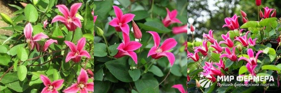- Соцветия: отличаются ярким окрасом и весьма необычной формой. Лепестки имеют удлиненную форму и заострены к краю. Благодаря этому распустившееся соцветие клематис напоминает тюльпан. Лепестки окрашены в насыщенный розовый цвет, а тычинки – ярко-желтые, что создает приятный контраст.