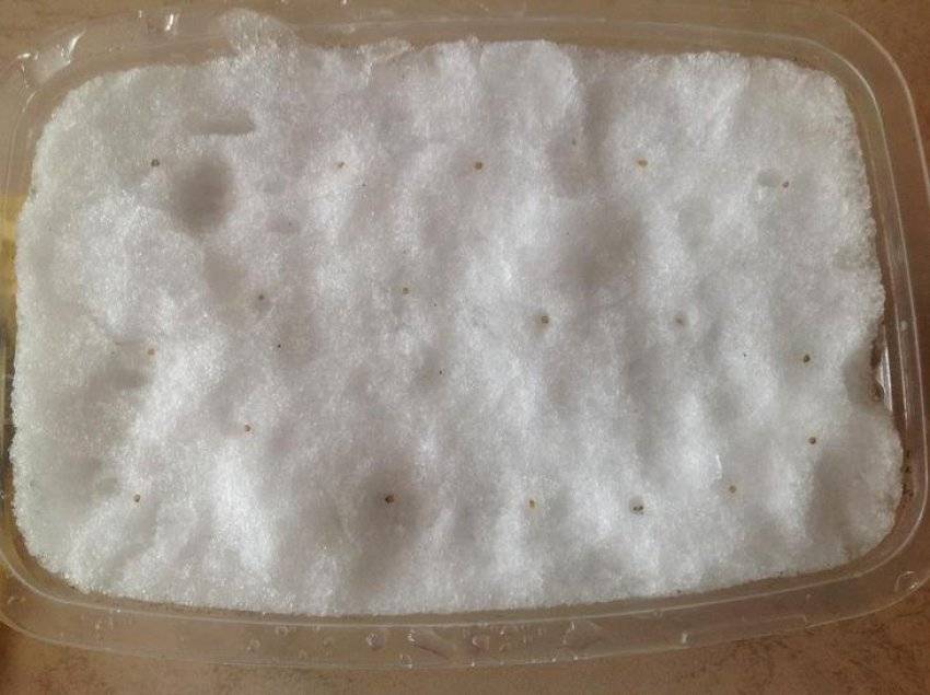 - Высаживать семена нужно не обычным способом, а через снег. На грунт выкладывается горсть снега, семена выкладываются сверху (для этого их держали в холодильнике). Снег медленно тает, и вода аккуратно «забирает» семена под землю.