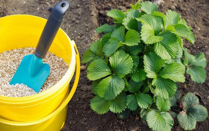 - В первый год после высадки рассады культура в удобрениях не нуждается. Начиная со второго года жизни растение начинают активно подкармливать. Первая подкормка проводится сразу после окончания холодов, ранней весной. В это время садовую землянику желательно подкармливать нитроаммофоской (раствор готовят так: в ведре воды разводят 1 столовую ложку вещества).