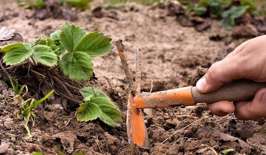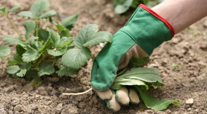 Сорняки удаляют по мере их появления. Растения вытягивают из грунта элементы, необходимые клубнике, поэтому их нужно убирать из междурядий своевременно. Кроме того, наличие сорняков ухудшает эстетический вид грядок и усложняет сбор урожая.Удобно удалять сорные травы вместе с рыхлением. Так сорняки выходят из грунта вместе с корнем.