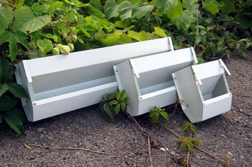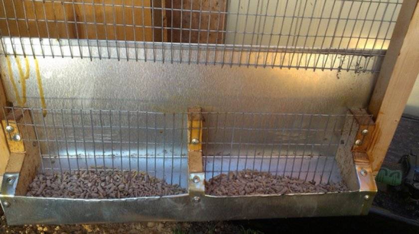 Для бункерной емкости прекрасно подойдут и листы толщиной 0,5 мм. Конструкция из оцинкованного железа состоит из задней, передней стенок и лотка. Иногда оснащают ограничителем, чтобы кролики экономили корм.