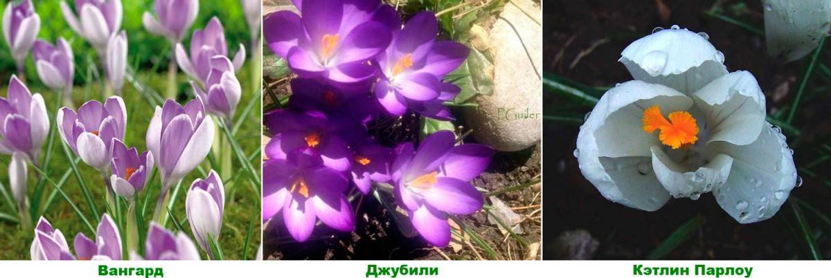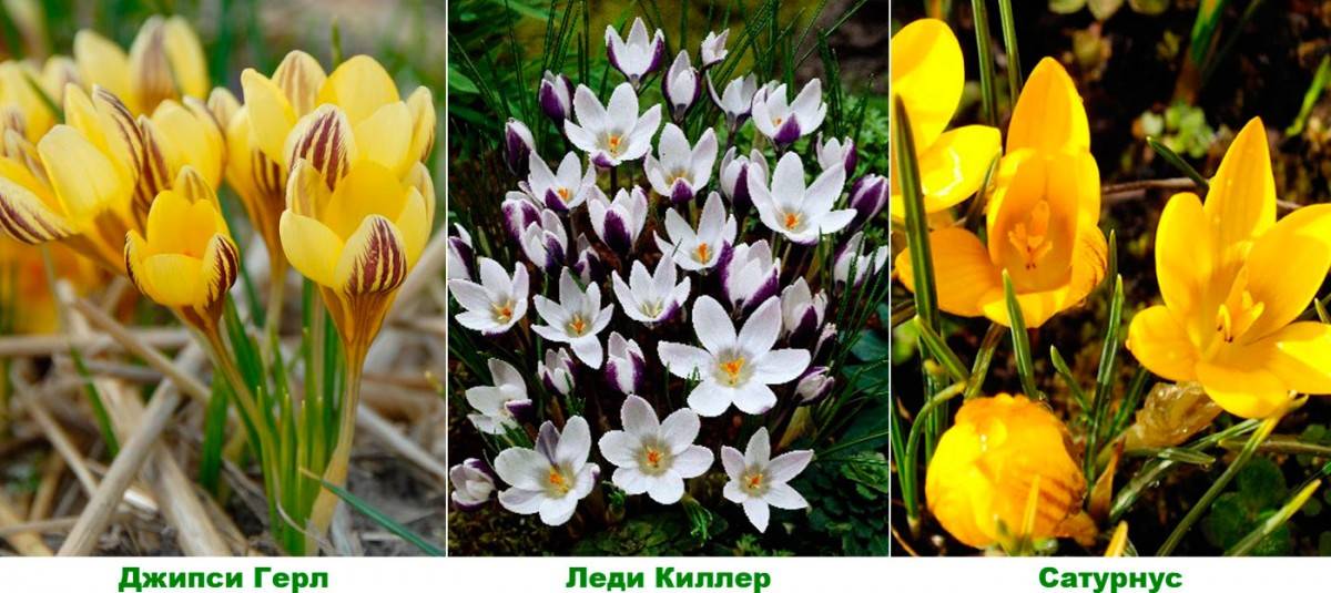 Весной распускаются крокусы, которые объединены в 14 групп, состоящих из сортоформ. В садах высаживают следующие популярные виды, раскрывающиеся в апреле – мае на 3 недели: