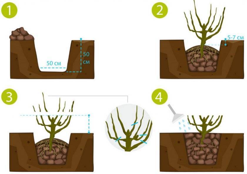 - Выкопать посадочные ямы размером 50×50 сантиметров и глубиной 60 сантиметров.
