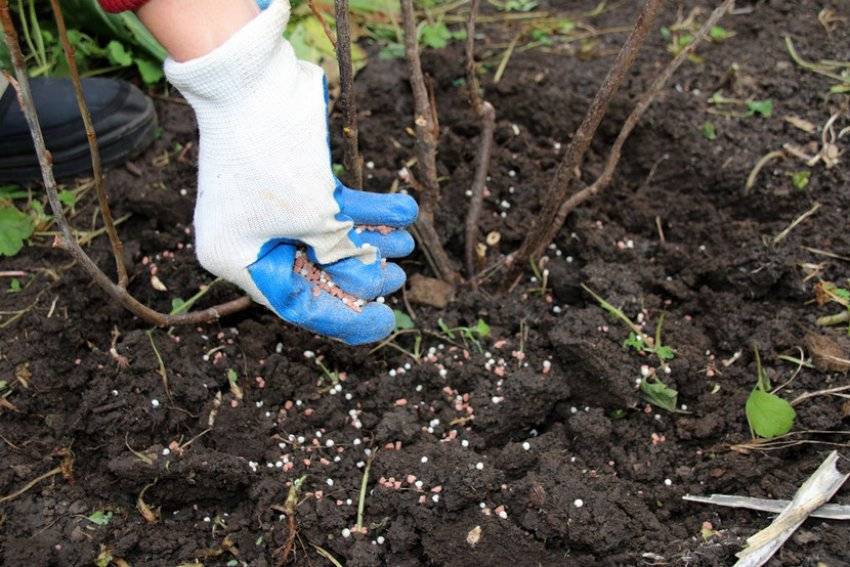 Осенью после сбора урожая вносят калийно-фосфорные удобрения, которые укрепят корневую систему и древесину растения на зиму. Вносят под куст по две столовых ложки суперфосфата и хлористого калия.