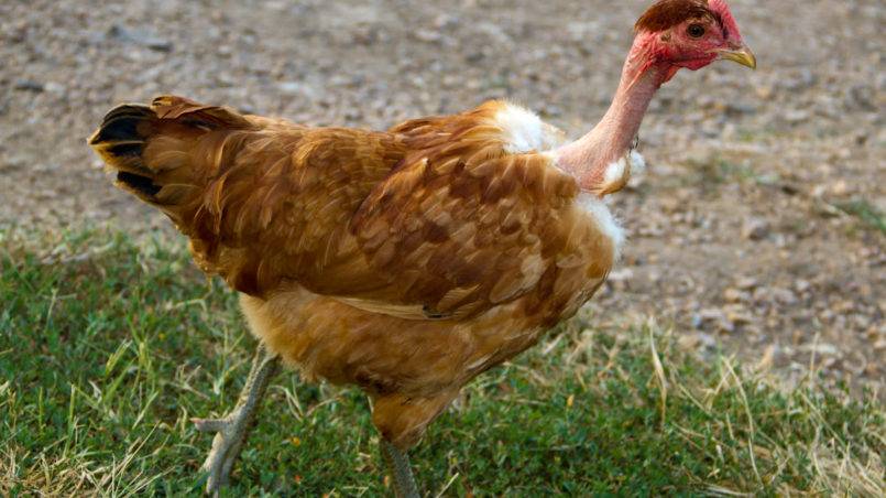 Основной отличительный признак — отсутствие оперения на шее, связан с генетикой. У этого вида птиц априори недоразвиты перьевые фолликулы. То есть, уже только вылупившиеся цыплята не имеют в этой части тела оперения. С возрастом же кожа на шее становится более грубой и морщинистой, приобретает насыщенный красный оттенок.