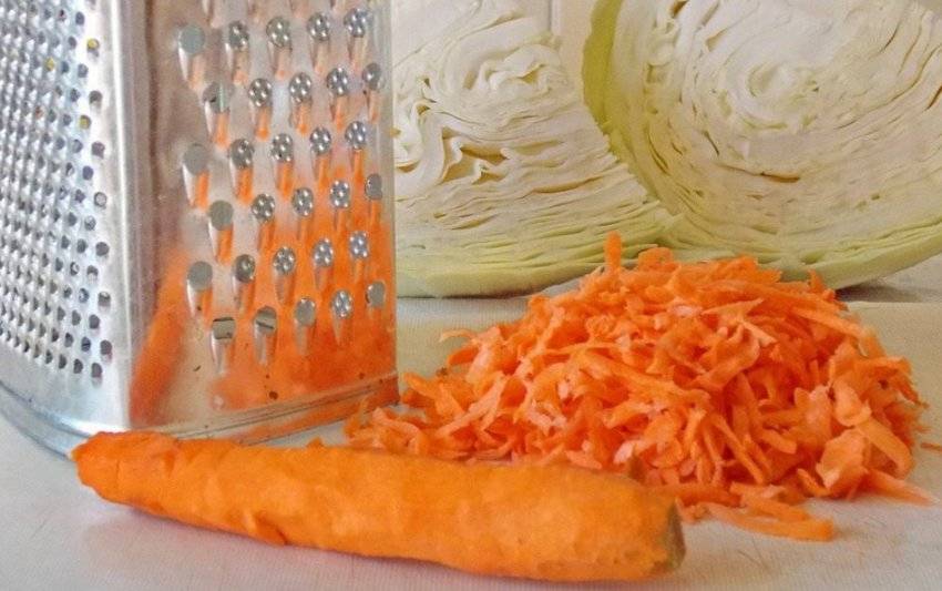 - Морковка чистится и натирается на крупной терке. После добавления в нарезку нужно сильно промять смесь, пока морковь не даст сок.
