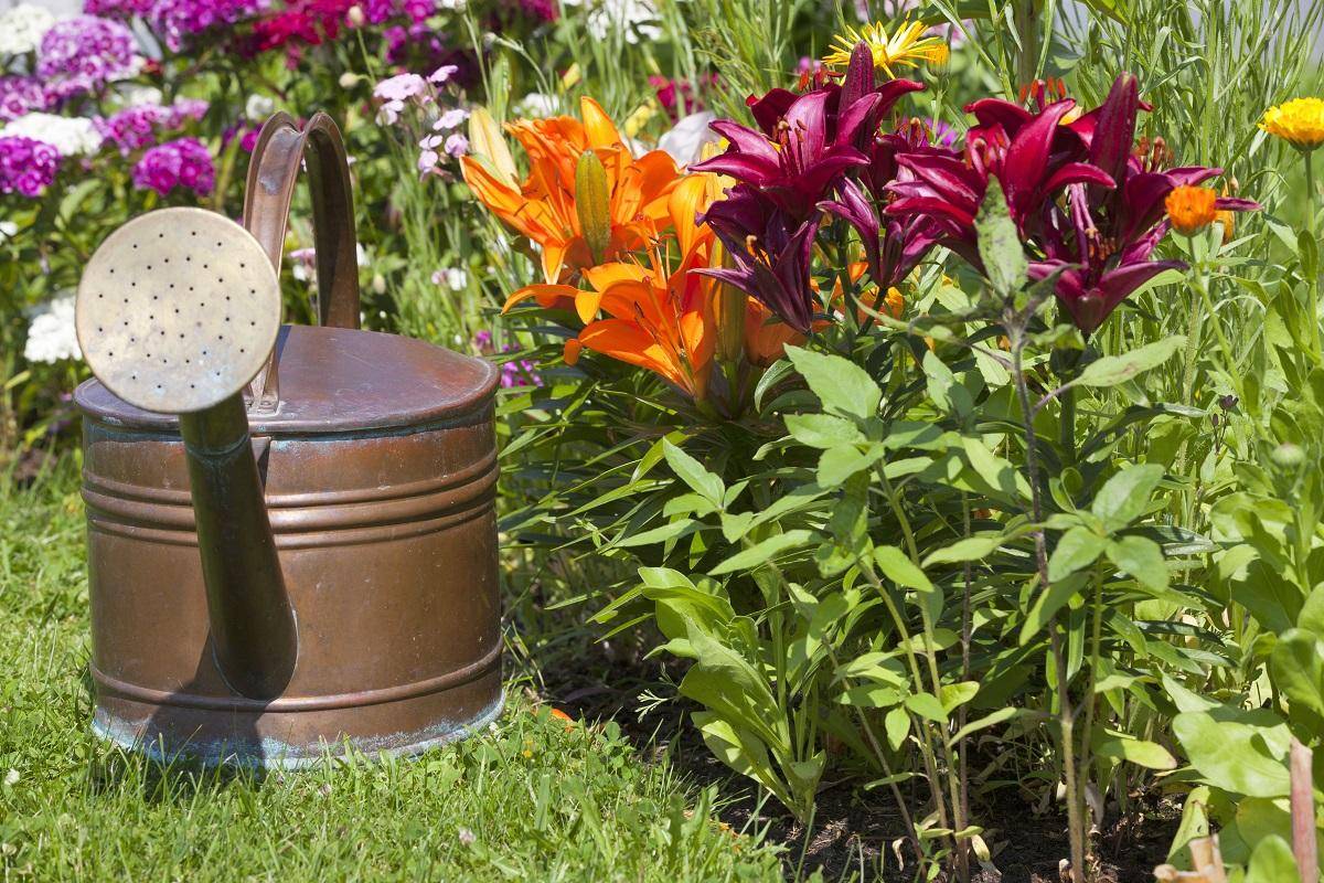 Эти прекрасно цветущие растения нуждаются в умеренно влажном грунте. В том случае, если лето выдалось дождливым, от полива следует отказаться, дабы не спровоцировать гниение луковиц. Оптимальным способом полива лилий является увлажнение под корень по мере подсыхания грунта. Для этого вокруг стебля каждого растения рекомендуется организовать поливочные лунки. Полив дождеванием для лилий подходит в меньшей степени, так как может стать причиной заболеваний и повреждений соцветий.