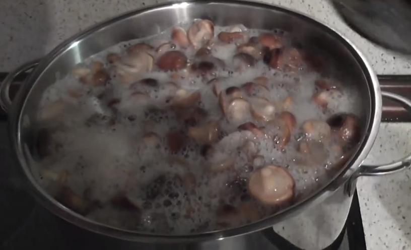 Затем в подсоленной воде, посолите по вкусу отварите в кастрюле грибы. Время варки примерно 5 минут. После слейте воду. Свежих грибов было почти что 1,5 кг, а после того, как отварите будет 750 г они к сожалению увариваются почти что вдвое.