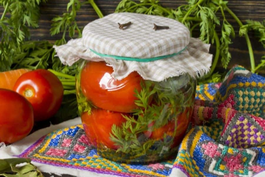 Плотные, мясистые плоды в маринаде с добавкой из ботвы морковки эффектно смотрятся в банках, отличаются насыщенным, слегка сладковатым вкусом с пикантной остринкой, и съедаются буквально за раз. Очень вкусные закатки делаются из расчета на 1 литровую банку:
