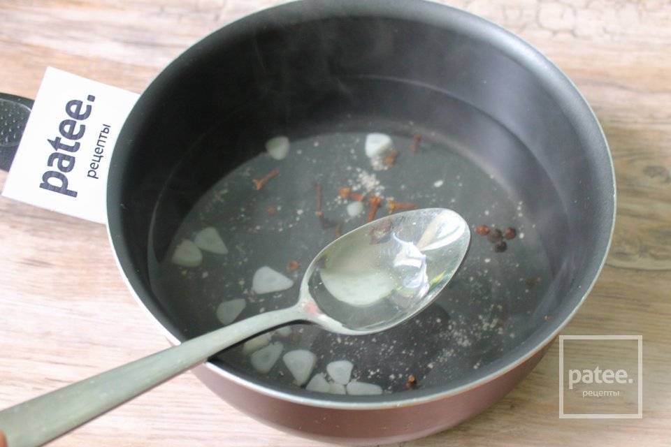 - В кастрюле вскипятите 100 мл воды. Добавьте уксус, сахар, специи, посолите и поперчите. Варите рассол минуту после того, как закипит.