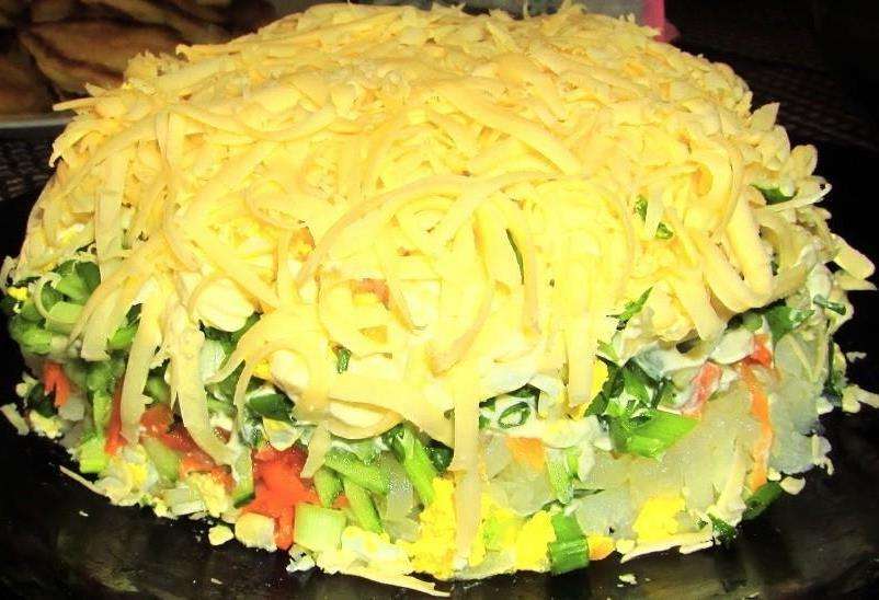 - Последний слой – тертые яйца. Майонез поверх уже мазать не нужно.