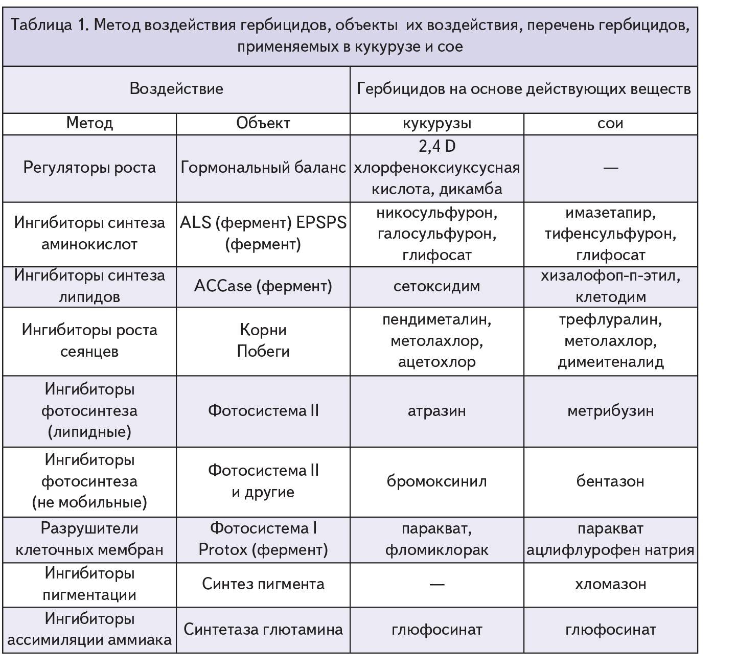 Гербициды различаются по степени риска возникновения популяций сорняков, устойчивых к гербицидам. Появление устойчивых к гербицидам сорняков стало широко распространенной проблемой для гербицидов следующих трех групп: 1) ALS ингибиторов, 2) ACCase ингибиторов и 3) ингибиторов фотосистем II (табл. 1).