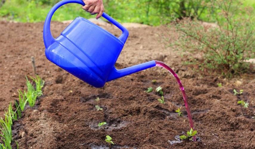- Полив грунта. Взять 3–5 гр. марганцовки на 10 л. воды. Полить землю непосредственно перед посадкой семян. Предохраняет от заболеваний.