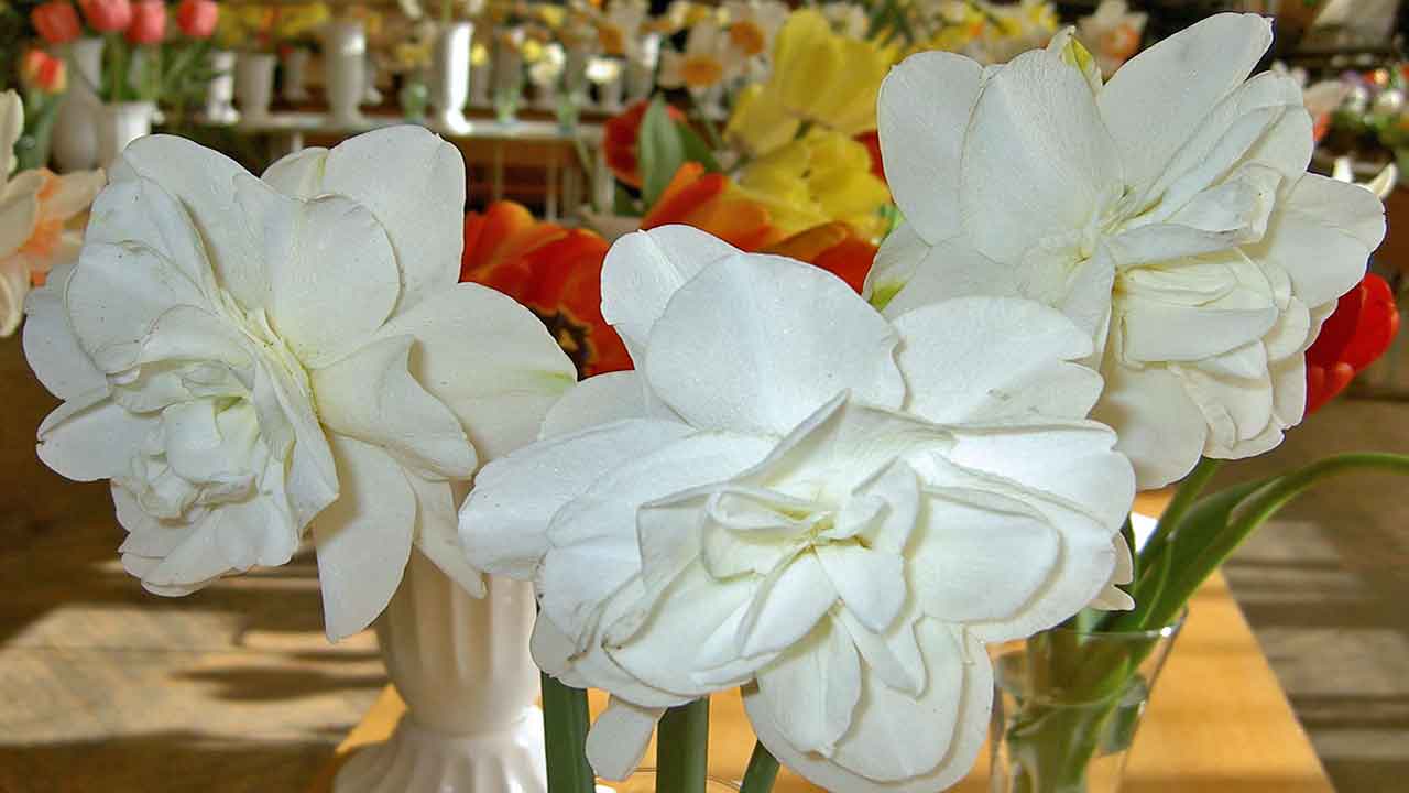 Многоцветковые махровые нарциссы иногда называют букетными. Нарцисс «Сэр Уинстон Черчилль» | narcissus `Sir Winston Churchill` — 1966 год регистрации, устойчивый в нашей климатической зоне представитель многоцветковых махровых нарциссов, 4W-O с белым околоцветником и оранжевой коронкой. Самого позднего срока цветения многоцветковый махровый нарцисс «Чирфулнес» | narcissus `Cheerfulness` 4W-Y известен с 1923 года. Прекрасный срезочный и пригодный для выгонки нарцисс Нарцисс многоцветковый «Брайдел Краун» narcissus `Bridal Crown` 4W-Y с белым околоцветников и короткой ярко-желтой коронкой. Очень ароматный! Ранний нарцисс махровый многоцветковый «Эрлишер» | narcissus `Erlicheer` — 1951 год регистрации, относится к группе махровых нарциссов