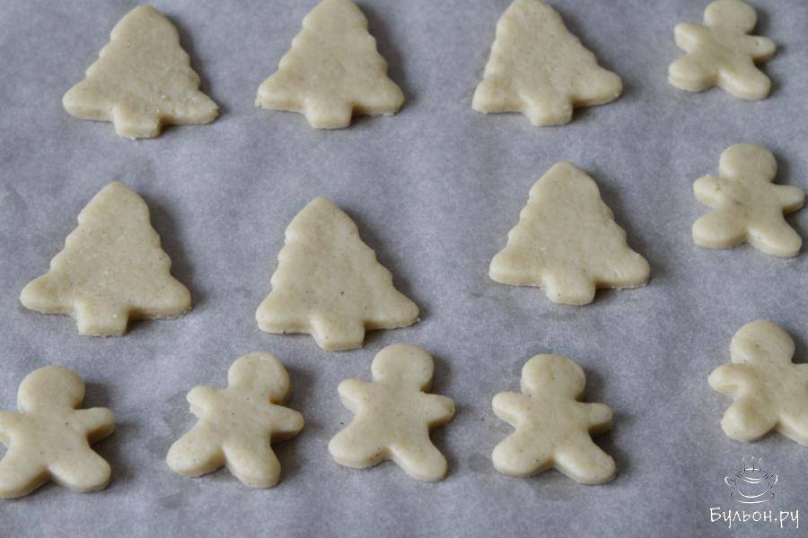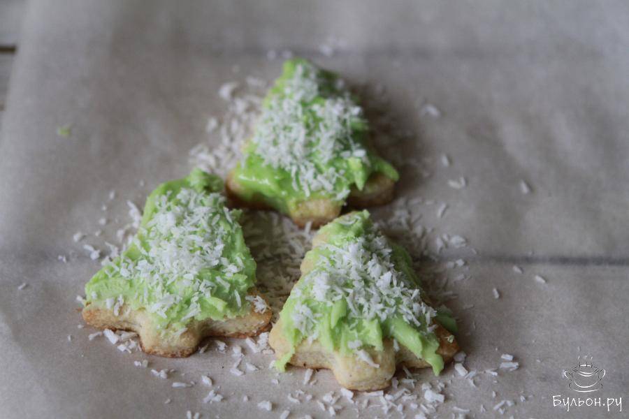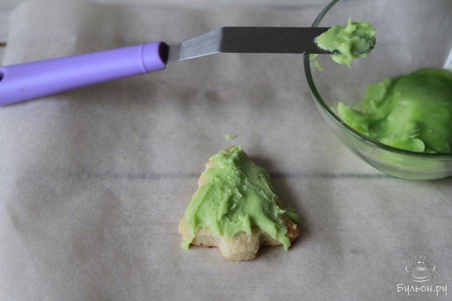На подготовленный противень стелют кондитерскую промасленную бумагу, располагают на ней заготовки и отправляют запекать в духовой шкаф, разогретый до 180 °C примерно на 5-10 минут. В это время при помощи миксера взбивают яичный белок с сахарной пудрой и соком лимона до получения глазури. По желанию вводят краситель и украшают печенье узорами.