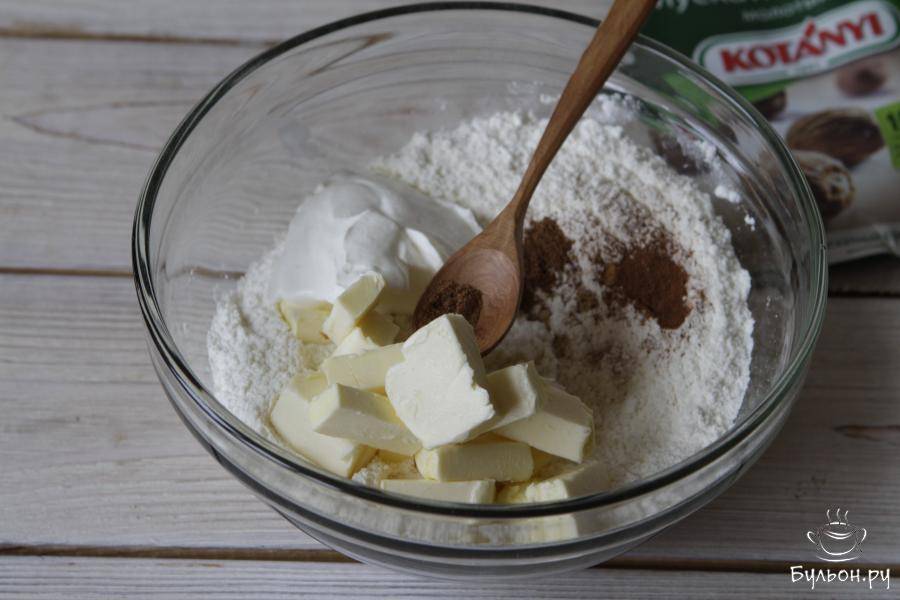 Шаг 1. Измельчите охлажденное сливочное масло (например, при помощи терки) и тщательно смешайте его с предварительно просеянной с разрыхлителем и мукой. Добавьте сахар.