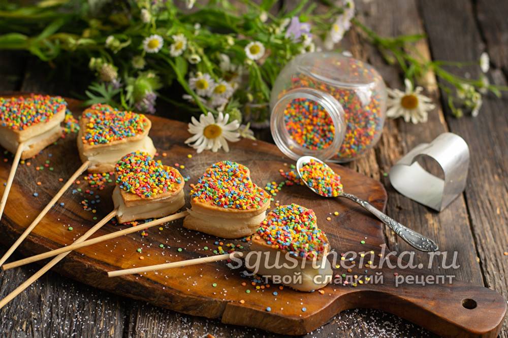 Рассыпчатое новогоднее печенье из песочного теста со сладкой прослойкой из белого шоколада, с разноцветной нарядной присыпкой да на деревянных шпажках, выставленное на стол в стеклянных вазочках/стаканах – радость для детишек. Сладкое угощение можно сделать в форме доброжелательных сердечек, елочных шариков, звездочек или елочек – чем богаче разнообразие, тем интересней подача и позитивней настроение.