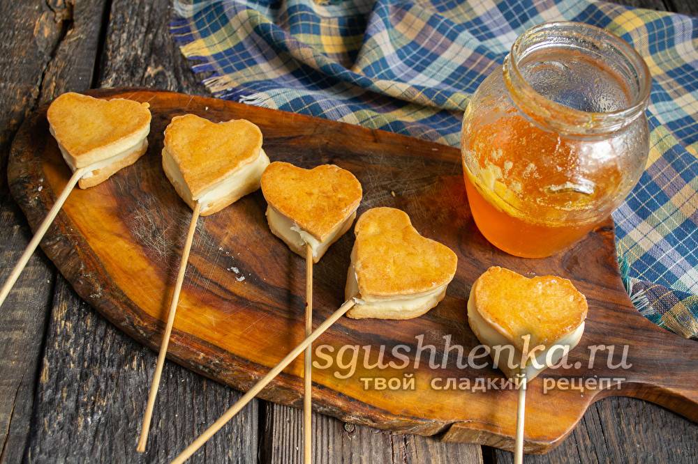 Смазать печенье жидким (можно растопленным, но не горячим) медом или выбранным джемом. Посыпать присыпкой. Убрать на полчаса в холодильник, а затем подать к столу, поставив палочками вниз в выбранную посуду либо разложив на блюде так, чтобы шпажки были снаружи, фигурки – внутри.