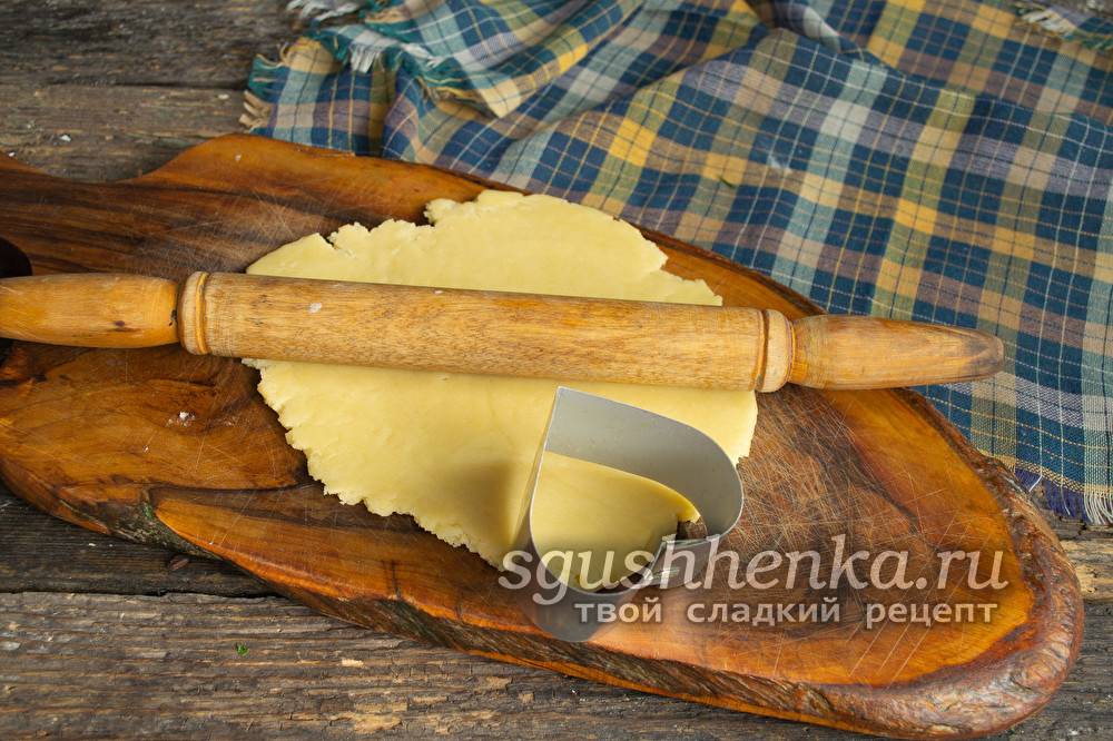 - Посыпаем рабочую поверхность мукой, достаем тесто, раскатываем пластом. С помощью фигурных формочек вырезаем печенье.