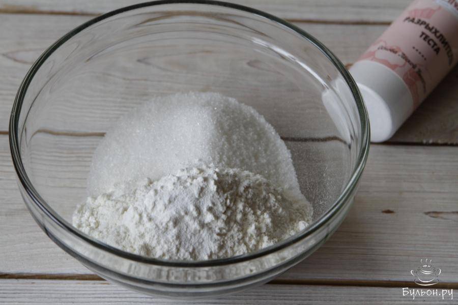 - В масляно-сахарную смесь засыпается мука. Предварительно ее смешивают с разрыхлителем.
