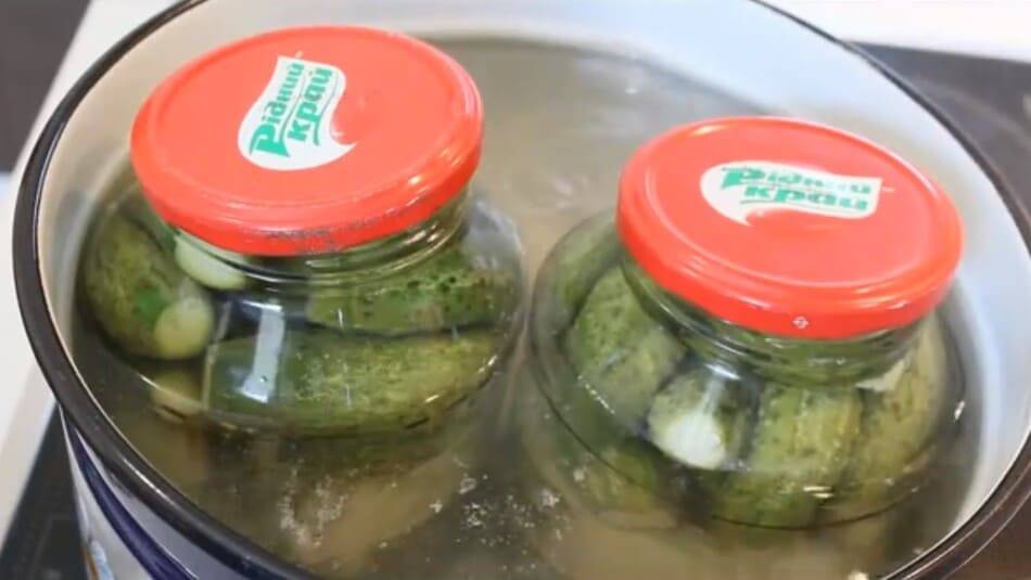 Внутрь кастрюли вливаем горячую воду до уровня плечиков банок. Включаем нагрев и доводим воду до закипания. С момента закипания стерилизуем овощи 10-15 минут (1,5 литровых банки).