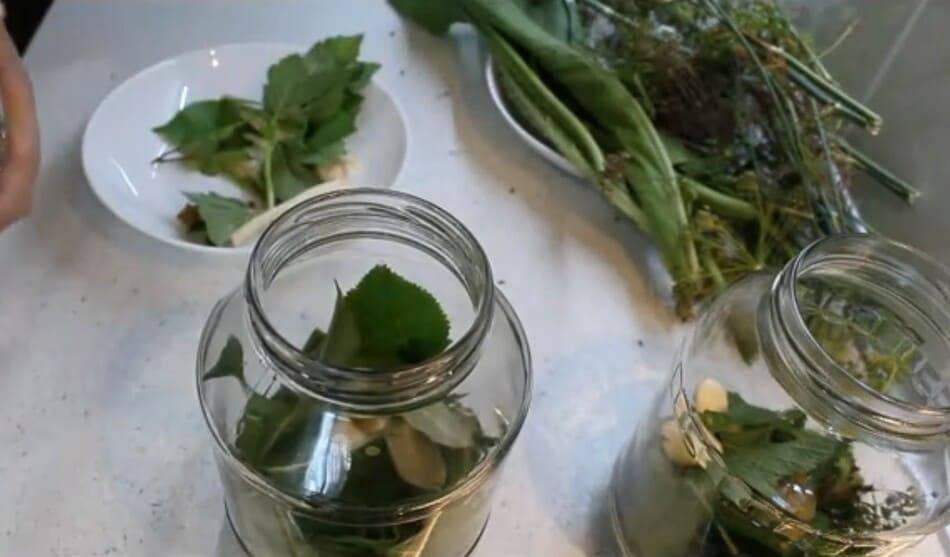 Банки желательно заранее подготовить – хорошо помыть и обдать кипятком. В чистые банки, на дно, выкладываем зелень – кусочек сельдерея, хрена, пару листочков вишни, дуба, смородины. Веточку укропа, пару зубчиков чеснока и совсем грамульку жгучего перца. Не знаю, но я люблю добавлять еще в соленые огурцы и лавровый лист.