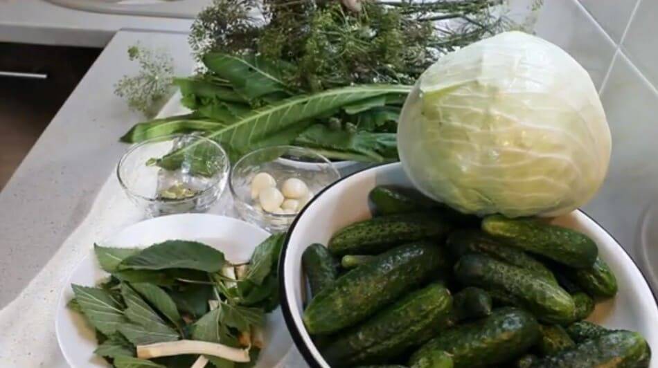Начнем с очень популярного способа маринования овощей. Из основных ингредиентов берем только огурцы и капусту. Остальное вкусовые и ароматные добавки. Засолочную зелень вы можете подбирать ту, что любите. Ниже приведен примерный ее состав, можно вообще убрать ее из консервирования.