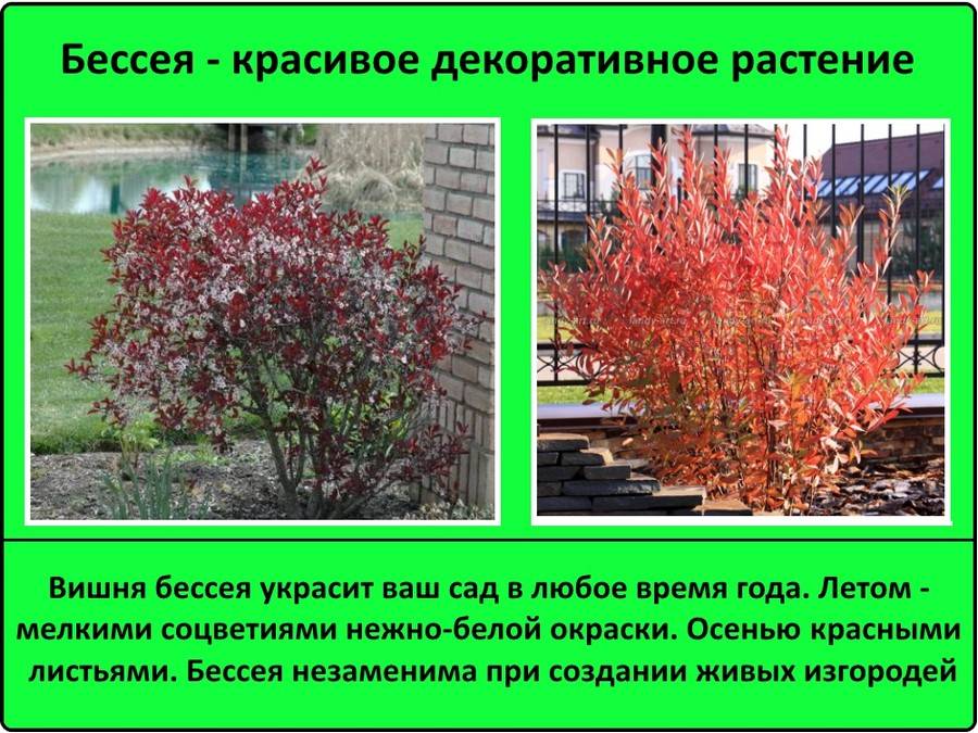 Помните, что родиной растения являются регионы Североамериканского континента с умеренным, сухим климатом. Бессея любит тепло, поэтому идеальным местом для нее станут солнечные участки дачного участка, защищенные от холодного северного ветра. Почва подойдет любая, но лучше всего вишня чувствует себя на супесчаном грунте, удобренным гумусом.