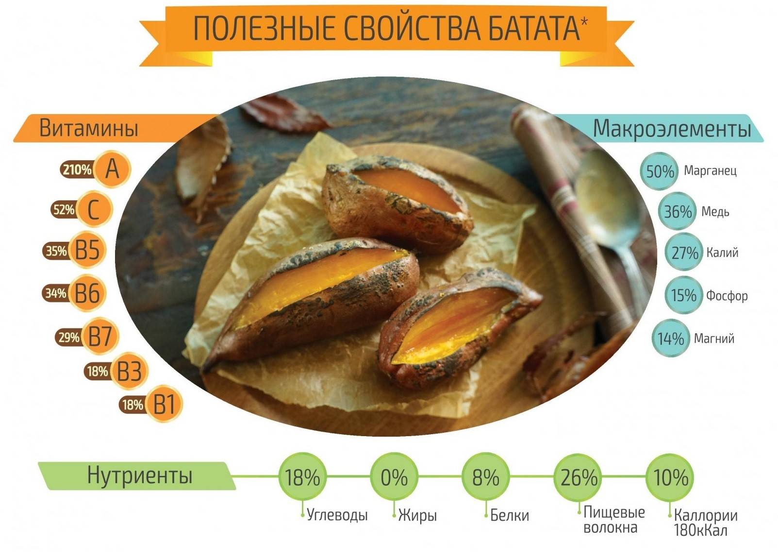 Многие называют батат сладким картофелем, это связано с его формой и большим содержанием крахмала в продукте. По вкусу же плод напоминает тыкву, свеклу или каштан в зависимости от способа приготовления и цвета мякоти. Помимо приятного вкуса, батат обладает полезными свойствами и противопоказаниями.