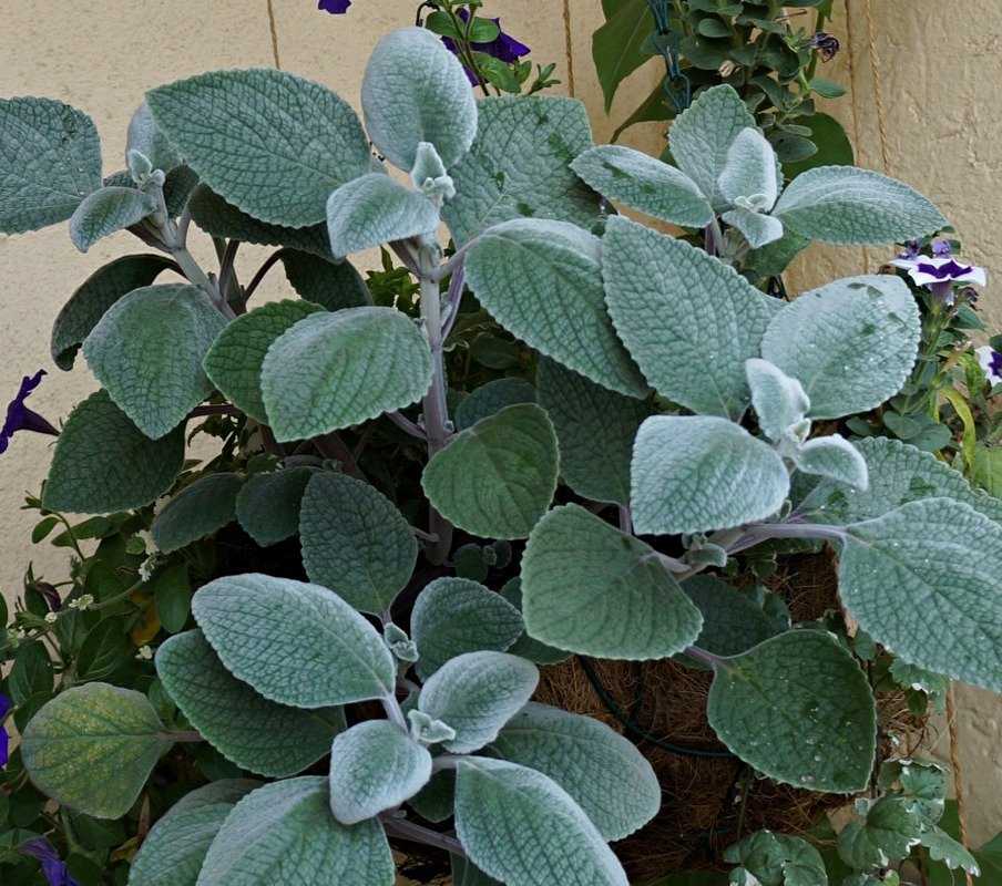 Плектрантус серебристый (Plectranthus argentatus) ценится благодаря привлекательной пушистой серо-зеленой листве, словно покрытой изморозью. Чаще всего, у нас выращивается его сортовая вариация «Сильвер Шилд» (Silver Shield). Этот культивар компактнее видового растения обычно вырастает до 30 см в высоту и до 60 см в ширину. Листья яйцевидные, остроконечные, серо-зеленые с гребенчатым краем, покрыты плотным серебристым опушением. Стебли приподнимающиеся, но в подвесных корзинах кустик растет как ампельный. Трубчатые голубовато-белые цветки собраны в колосовидные соцветия, распускаются в середине лета.