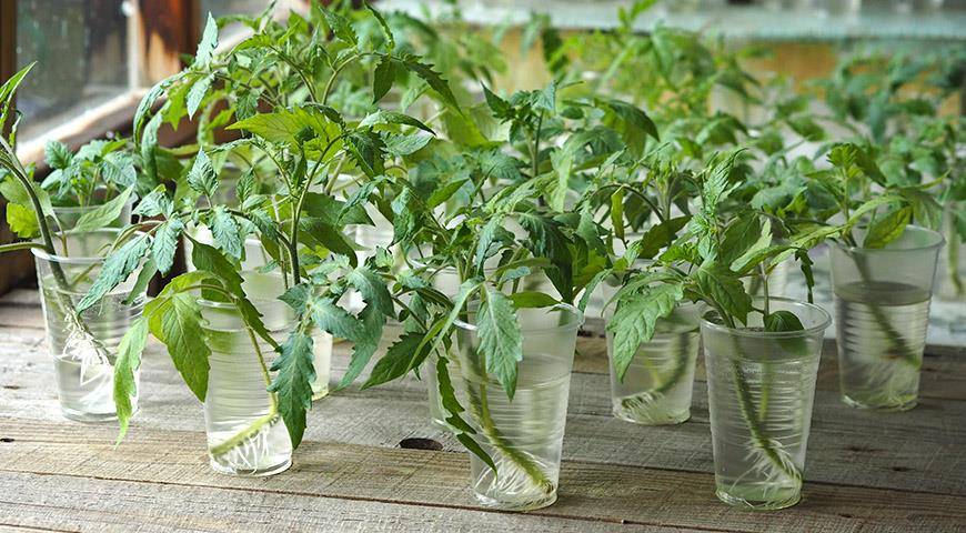 Допускает китайский способ пикировки и укоренение срезанных сеянцев томатов в воде. Для этого рассаду обрезают у земли, как и в первом случае, но далее помещают не в грунт, а в стаканы с водой. Емкости с растениями убирают в затемненную прохладу и оставляют на 5-7 дней. Никаких дополнительных препаратов к воде подмешивать не нужно, помидоры прекрасно дают корни без них.