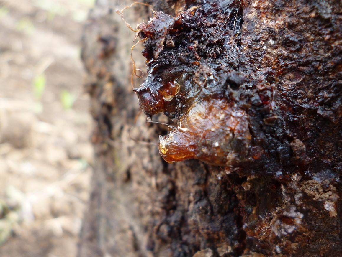 Поверхность веток и побегов усеивают многочисленные мелкие округлые пятна. Цвет их — бурый, красно-бурый либо светло-коричневый (вариант окраски на молодой коре: темная или красноватая кайма вокруг сравнительно светлого центра). Со временем они удлиняются, растрескиваются, оборачиваются ранками и язвочками, из которых нередко в качестве защиты выделяется гумми . На ветвях старших возрастов образуются вздутия коры, тоже превращающиеся в некрасивые трещины и разнокалиберные язвы с истечением гумми. Укорачиваются расстояния меж точками прикрепления листьев (так называемые междоузлия). Почки, атакованные возбудителем болезни, отмирают, становятся черными — и, не исключается, «лакированными» (блестящими) благодаря тоненькой пленке камеди. Они еще повисят на дереве несколько суток. Цветки и завязи (если успели возникнуть к моменту заражения) осыплются. Наиболее отчетливо прорисовывают картину заболевания листья. На их пластинках появляются в большом количестве пятна. Формы — преимущественно округлые. Диаметры — от 3 до 6 миллиметров. Окраска центральных зон — бледно-коричневая (светло-коричневая), буро-красноватая, просто красноватая (эта постепенно делается желто-бурой). Хорошо заметна каемочка — красная, красно-бурая или малиновая. Спустя 1-2 недели ткань внутри каждого пятна выкрашивается — и листья уподобляются специально издырявленным донышкам дуршлагов. Аналогичные пятна видны на черешках — значит, те вскоре потеряют проводимость, прочность и удерживающую силу, вследствие чего листья лишатся питания, высохнут полностью и отвалятся преждевременно. Такой «досрочный листопад» особенно присущ нижним частям кроны. Грибок Clasterosporium carpophilum способен на протяжении вегетационного периода «оккупированного» дерева давать — и дает! — не одно поколение спор. Посему их хватает с лихвой и на то, чтобы поразить плоды (если до оных все же дошло). Поначалу на поверхностях плодов пятнышки невелики. Цвет у них красновато-бурый, чисто красный либо пурпурный. Под пятнышками нормальное развитие ткани плода тормозится, то есть они как бы вдавлены (вмяты) в нее. Затем они темнеют (точнее: коричневеют), увеличиваются вширь (диаметрами достигая 3 миллиметров) и выпячиваются ввысь (приобретая вид бородавок). Если (против обыкновения) заражение запоздало — вполне вероятно, что пятна останутся плоскими. Но когда бы оно ни случилось: — во-первых, из них будет сочиться гумми; — во-вторых, формы плодов уродуются (у вишенок и черешенок мякоть вообще прекращает свой рост, усыхает и разрушается вплоть до того, что косточки оголяются).