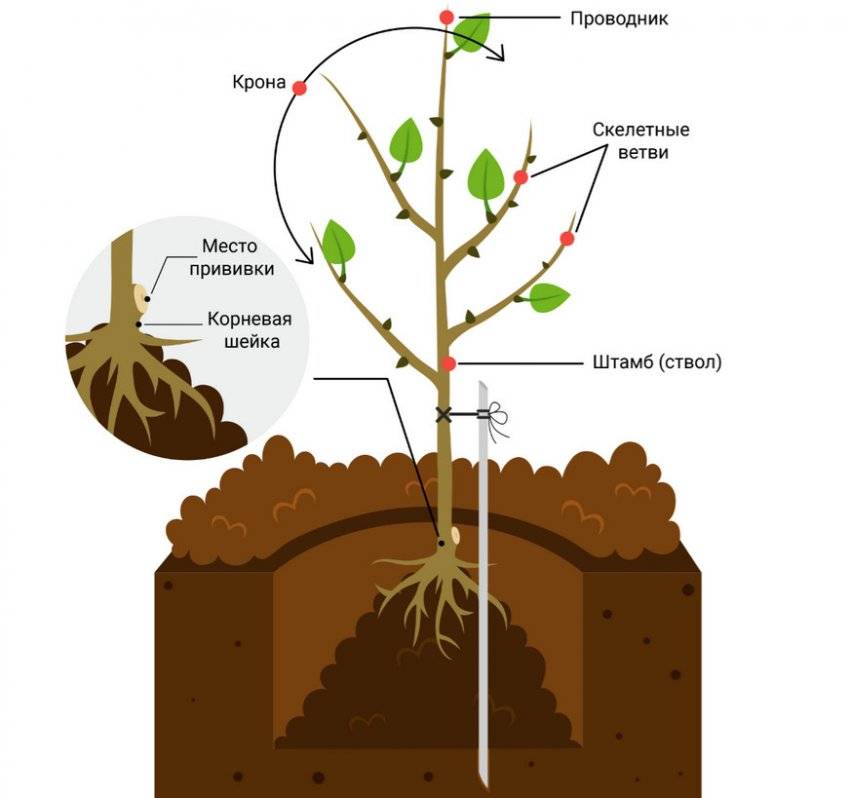 Посадочную яму закапывают таким образом, чтобы место прививки было чуть выше уровня грунта.