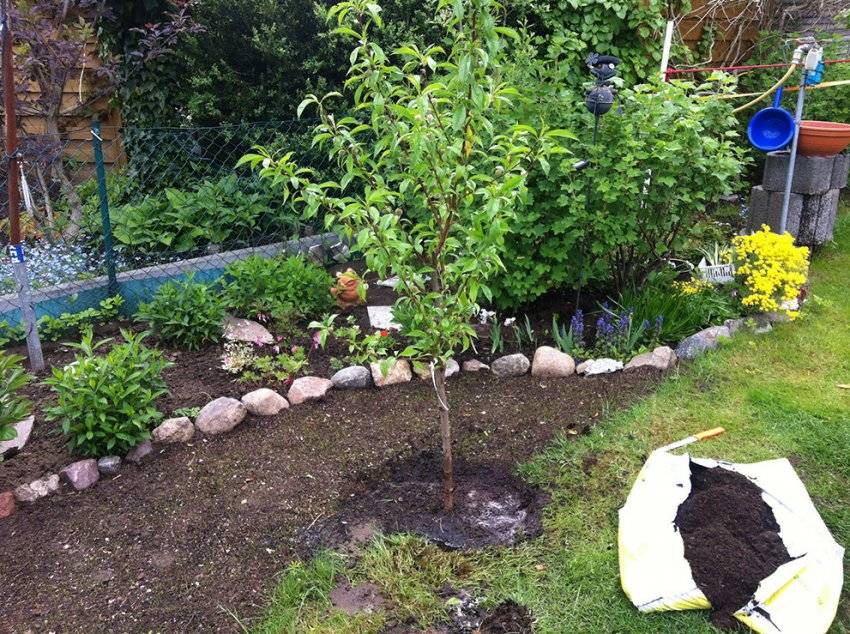 На дно ямы насыпают смесь плодородного грунта и навоза (10 кг) — 1/3 от объёма выкопанной почвы.