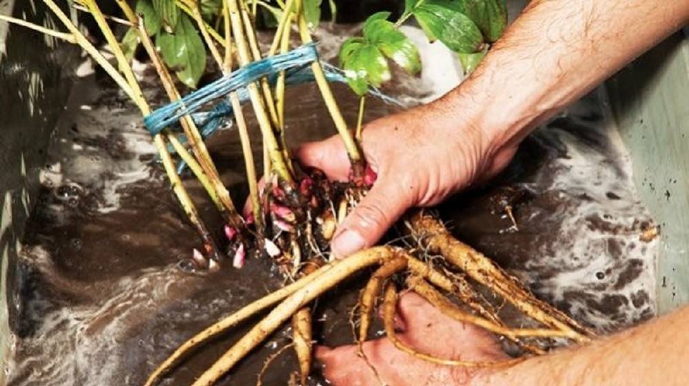 Затем корни промывают, чтобы лучше видеть почки, и делят топориком на куски по 12-20 см.
