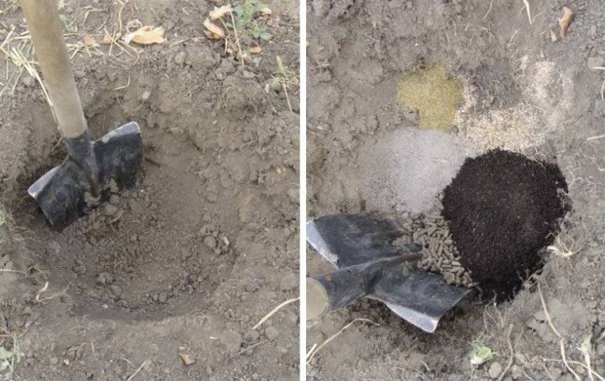 Осеннее высаживание осуществляется в начале октября. Сначала нужно выкопать лунки, размеры которых составляют 50×60 см. Дистанцию между рядами определяют в зависимости от размеров посадочного материала. Если вы сажаете низкорослые кусты, то достаточно 60 см. Посадка среднерослых растений осуществляется на дистанции 100 см между рядами. Для кустов с высоким темпом роста потребуется 130 см.