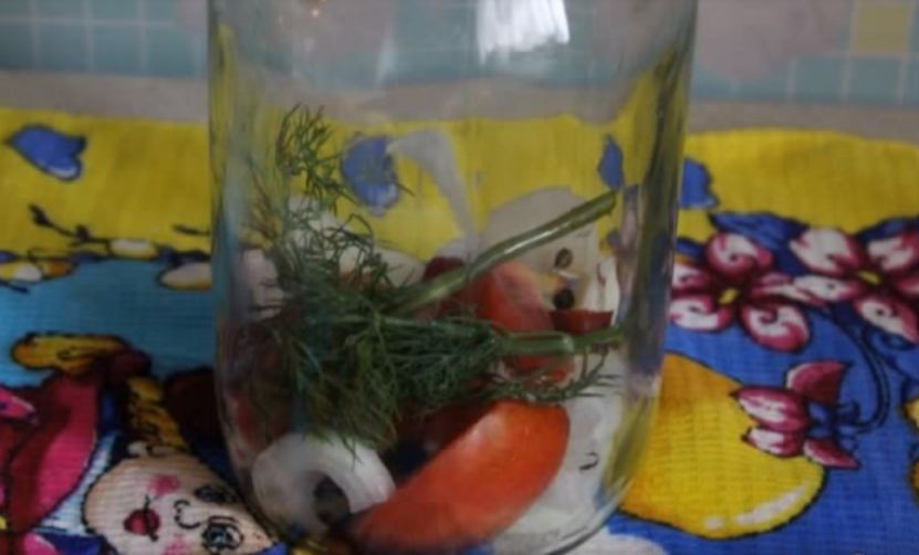 - Выложите слоями томаты, лук и укроп. Заполняйте банку до горла.