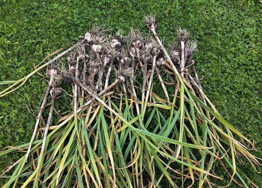 ✓ собранные чеснок вместе с наземной частью оставляют на грядке или пленке на сутки (за это время подсыхает земля на головках);