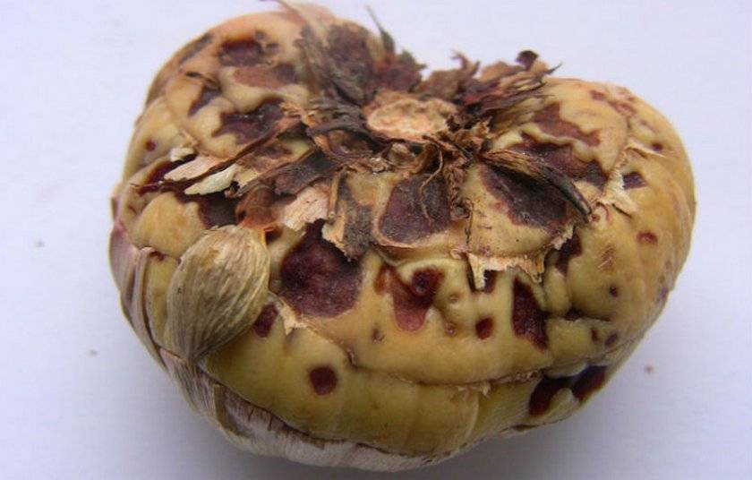 Наличие коричневых пятен, язв, вмятин по бокам, трещин на донце, плесени на покровных чешуйках говорит о повреждении болезнями и вредителями. Наметившиеся корешки должны быть светлого, а не темного цвета