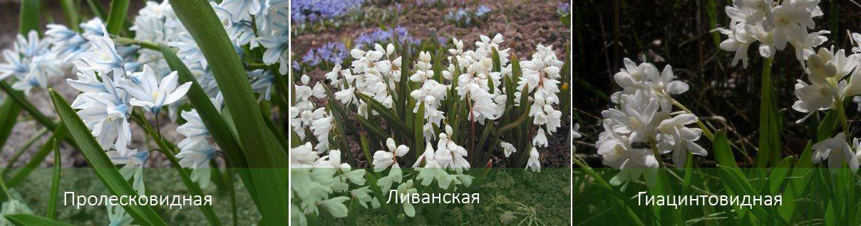 Пушкиния Ливанская Альба и Пушкиния Либанотика Альба. В процессе произрастания эти сорта практически не имеют отличий. Высадка происходит при помощи семян или луковиц. Процесс осуществляется осенью.
