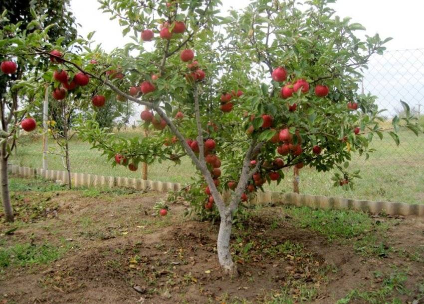Очень удобные для формирования среднештамбовые формы, в которых нижняя скелетная ветка расположена на высоте 80-110 см. Для создания этой формы все ветки, саженца яблони, расположенные ниже, необходимо вырезать.