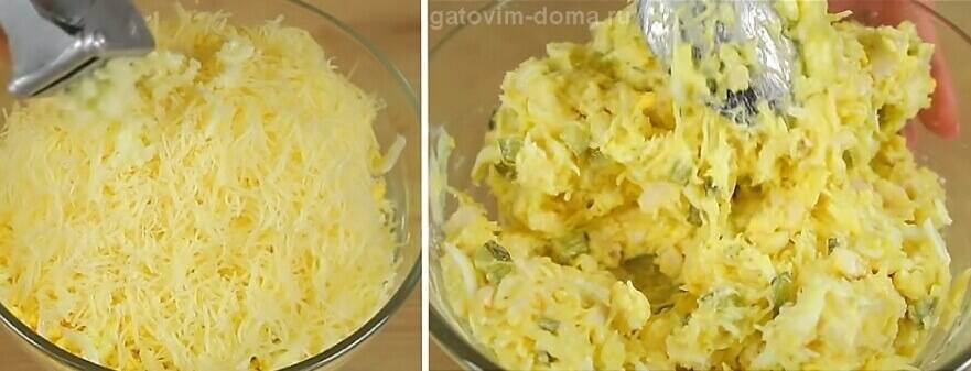 А тем временем приступаем к сборке салата — плавленные сырки натираем на крупной терке, добавляем к ним измельченный чеснок, мелко нарезанную зелень укропа, пару десертных или столовых ложек майонеза и все хорошенько перемешиваем.