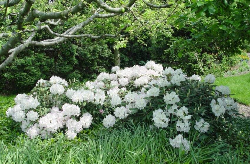 - Рекомендован также рододендрон морозостойкого сорта «Mikkeli», он белый, его листья очень интересно сложены.