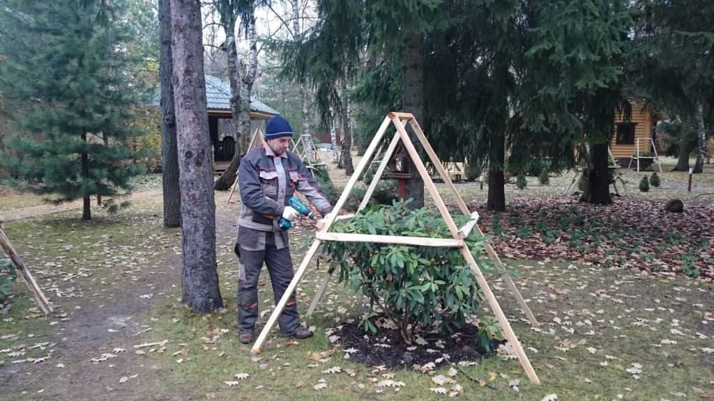 Молодую, слаборазвитую крону растения накрывают коробкой после качественного мульчирования грунта. Для защиты от раскисания под дождем и ветром стоит окутать защиту полиэтиленом. Для свободного воздухообмена целесообразно проделать отверстия. При культивации рододендрона в северных регионах целесообразно укрыть верх коробки лапником. Сено, солому, листву использовать не стоит, так как они являются любимым местом обитания грызунов.