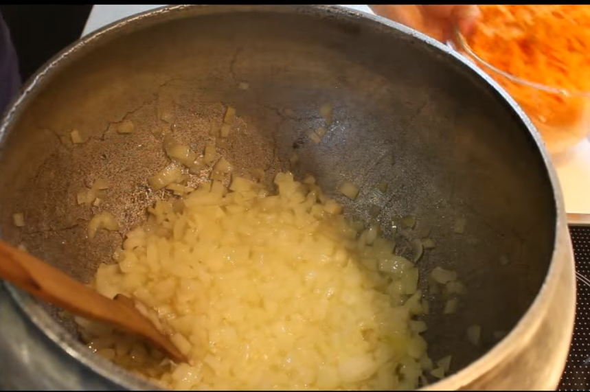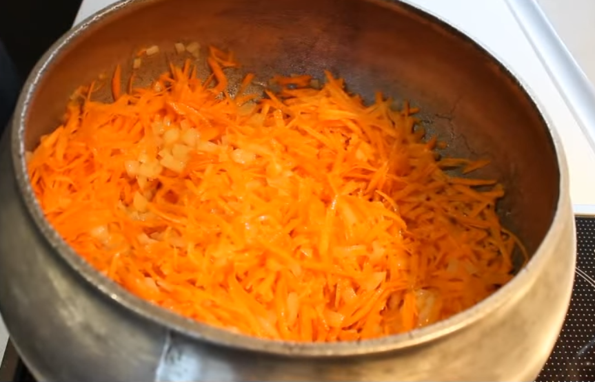 Лук тонко режут и пассеруют, пока не размягчится. Затем туда же добавляют измельченную морковь. Все вместе готовят в течение 15 минут.