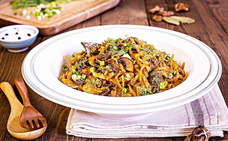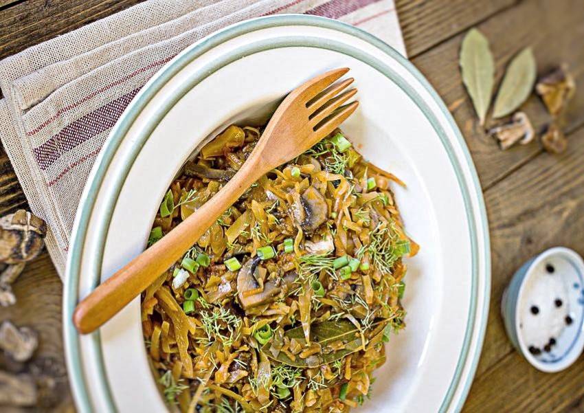 Как я уже упоминал, рецепт очень прост, но для его приготовления нужно время и терпение. Вам нужно регулярно помешивать капусту, чтобы ее цвет был приятно темным, но не подгорел. Я использовала сушеные грибы вместе со свежими, так как они придают всему блюду удивительный аромат и неповторимый вкус, а если сейчас подходящий сезон и вы любите свежие лесные грибы – используйте их (например, лисички, опята или свежие белые грибы). Это прекрасное вегетарианское блюдо. При желании лишнего белка – подавайте капусту с жареной курицей или сосисками.