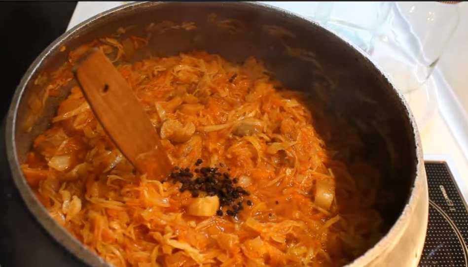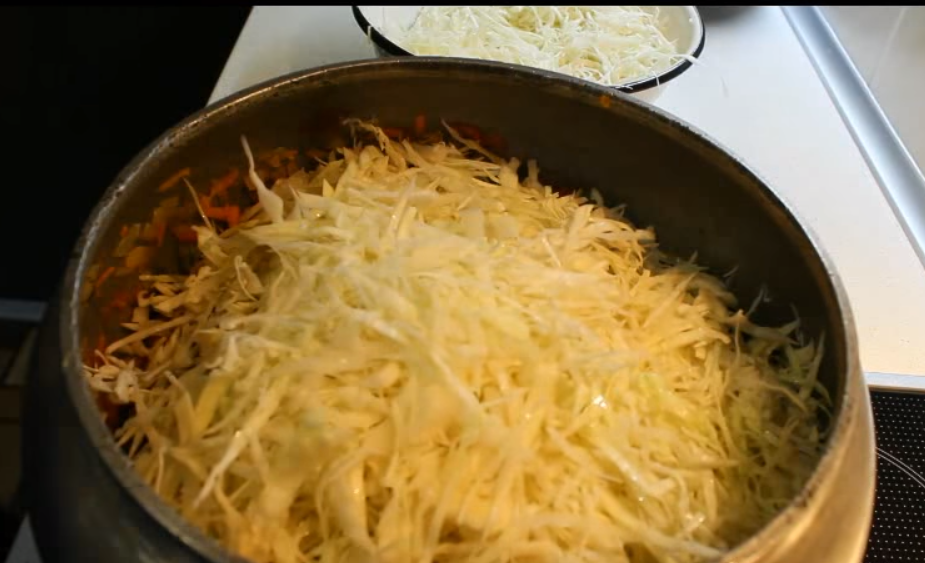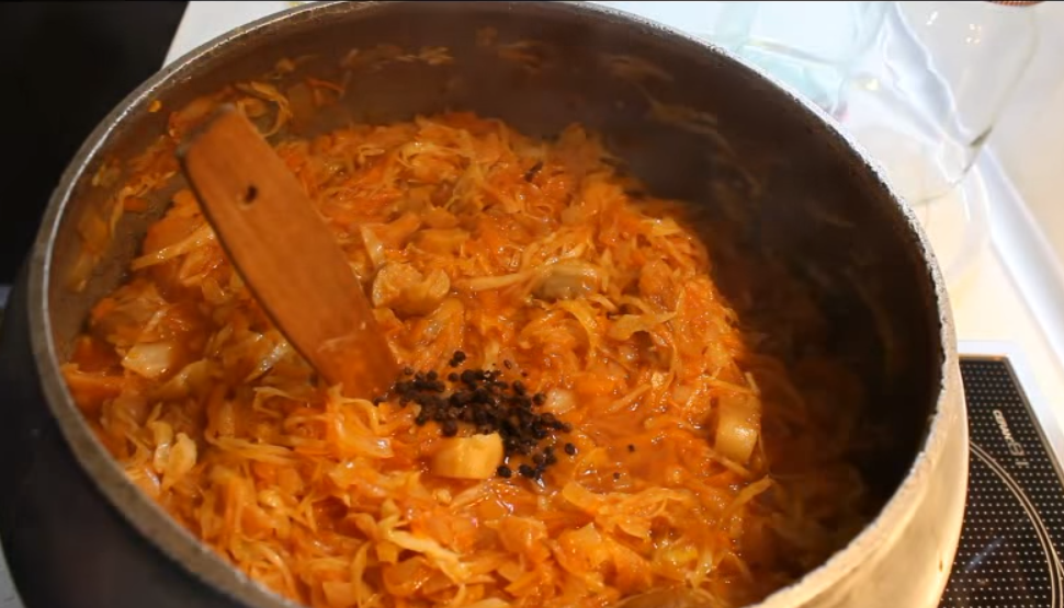 За это время белокочанная капуста заметно размягчится и станет прозрачной. Она уже почти готова, но еще слегка похрустывает.